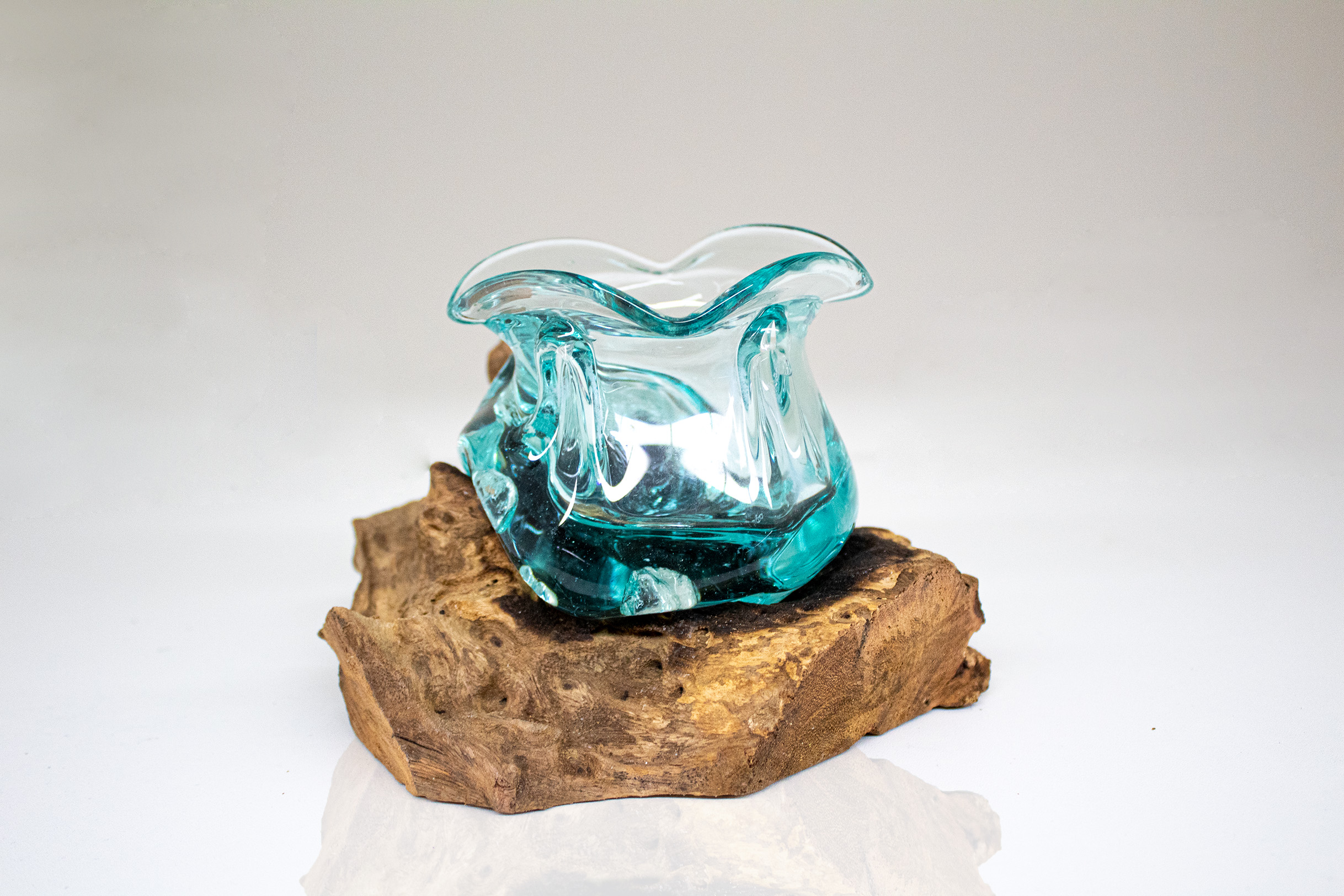 Unser mundgeblasenes Glas auf Wurzelholz vereint die Magie von mundgeblasenem Glas mit der Stärke und Stabilität von Wurzelholz. Es ist nicht nur ein Kunstwerk, sondern auch ein Symbol für die Schönheit der Natur und die Kunstfertigkeit von Handwerkern.