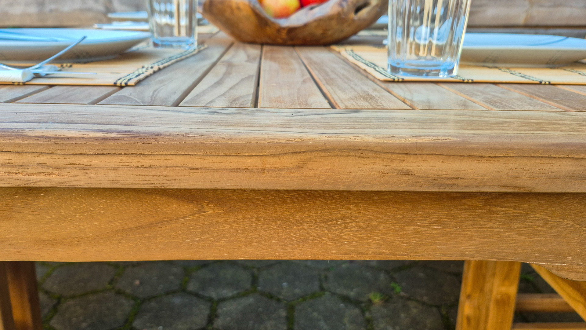 Dank der natürlichen Widerstandsfähigkeit von Teakholz ist der Tisch besonders witterungsbeständig und hält sowohl Regen als auch intensiver Sonneneinstrahlung stand. Die fein geschliffene Oberfläche sorgt für eine angenehme Haptik und betont die edle Maserung des Holzes. Mit der Zeit entwickelt das Holz eine ansprechende silbergraue Patina, die seinen natürlichen Charakter unterstreicht.